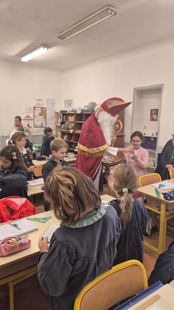 Le lundi 8 décembre, la tradition a été respectée : Saint Nicolas est venu à l’école, pour le plus grand bonheur des enfants ! Il a distribué de délicieux pains d’épices, laissant des sourires enchantés sur tous les visages.